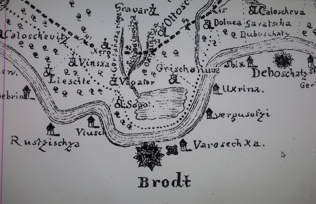 Ако је ово исправно, произилази да су трупе кренуле од Осијека и да су на подручју данашњег Полоја биле четвртог дана од поласка, а да је повратак био 24-тог дана. За разлики од претходне мапе гдје је мјесто уписано као Zoboth, сада је означено Sabot (Sopot), отприлике на подручју данашње Струге и колибарског пута, којим су трупе кренуле према Сарајеву. Занимљиво је да је Рушчица приказана нешто сјеверније, а на подручју гдје би она била, насупрот данашњег Полоја, уписан је Viusch (Вијуш), а након њега Klakar, Glogova Bebrinska i Bebrina. Након тог мјеста под именом Rabina i Moczol (Mocel или можда Моцељ) гдје су све уцртани чардаци са славонске стране. Занимљиво је да је насупрот Славонске Бебрине, на босанској страни уцртана села Gornia i Dolnia Bebrina, тј. Горња и Доња Бебрина. Исто тако на босанској страни иза Свилаја уписано је и мјесто Струга, као и између Брода и Лужана. На славонској страни, такођер, између Брода и Лужана назначена је и једна Бебрина. Да ли су то неке грешке приликом израде мапе или су заиста постојала мјеста са истим именима на обадве стране Саве није потпуно јасно. За Вијуш, па касније Полој, Клакар Свилај и још нека то је познато, да постоје и данас на обе стране Саве, али први пут видимо на некој мапи, да је и Горња и Доња Бебрина на босанској страни Саве. То ћемо покушати још разјаснити ако додјемо до каквих података.