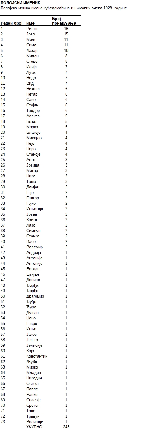 У наставку погледајмо и типична полојска имена према броју понављања. Узели смо у обзир очево име и име синова кућедомаћина. На списку се појављује и неколико женских имена али њих нисмо разматрали јер не знамо сва имена. Исто тако не знамо ни имена млађих чланова и дјеце у домаћинству. Унаточ тога, сматрамо да ће и наведена имена бити довољно репрезентативна да нам дочарају слику најчешћих имена која су се користила у периоду након првог светског рата, тј. 1928. године, кад је настао овај Уговор из кога смо црпили податке.