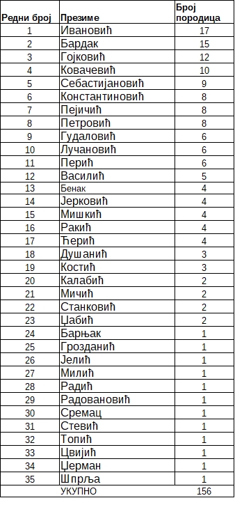 Претходну табелу смо систематизовали тако да се боље види редослед презимена према бројности фамилија.