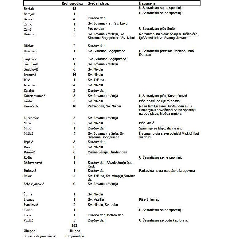 Анализирајући горњи преглед полојских породица и њихових слава који смо добили на бази уговора о откупу беговских земљишта из 1928. године, из којег смо користили списак породица које то земљиште користе од 1918, и Шематизма Дабро-Босанске епархије Српске православне из 1882. године, из којег смо узели преглед слава који славе поједини свећари на подручју парохија Винске и Лијшшће. Из тог разлога дошло је до неколико неподударности и нејасних података. Тако нпр. на списку из Шематизма појављују се породице Патковић и Вучановић, које се не појављују у Уговору о откупу земљишта. То би се могло тумачити, да су те породица после Првог светског рата отселила из Полоја или да због неког разлога нису судјеловала у откупу земљишта. С обзиром да поуздано знамо да су те породица била присутнеу Полоју као и друге, све донедавно док Полој није расељен, узрок треба потражити у разлозима одсуства са списка и Уговора о откупу.